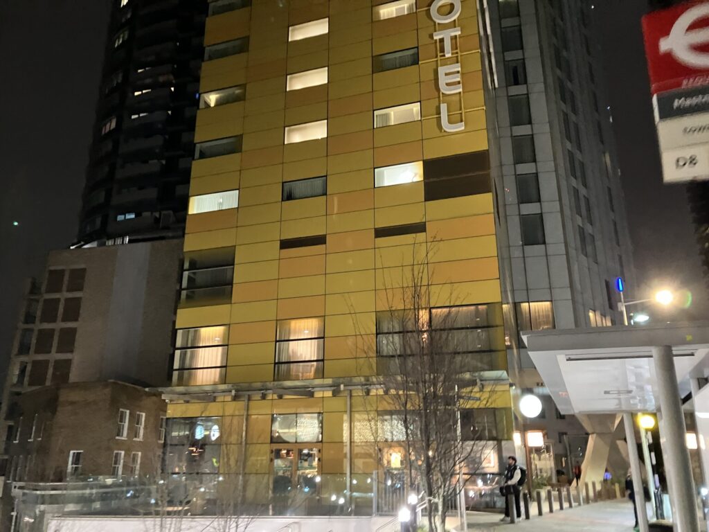 ロンドンは宿泊費がとても高いことで有名で、ロンドン市内に近づけば近づくほど、料金も高く、部屋も狭くなるとのことで、今回は前回宿泊した西側(HammerSmith)ではなく、東側にあるCanary Wharf(カナリーワーフ)駅のこちらのホテルに宿泊することにしました。