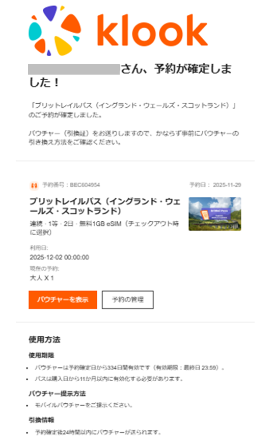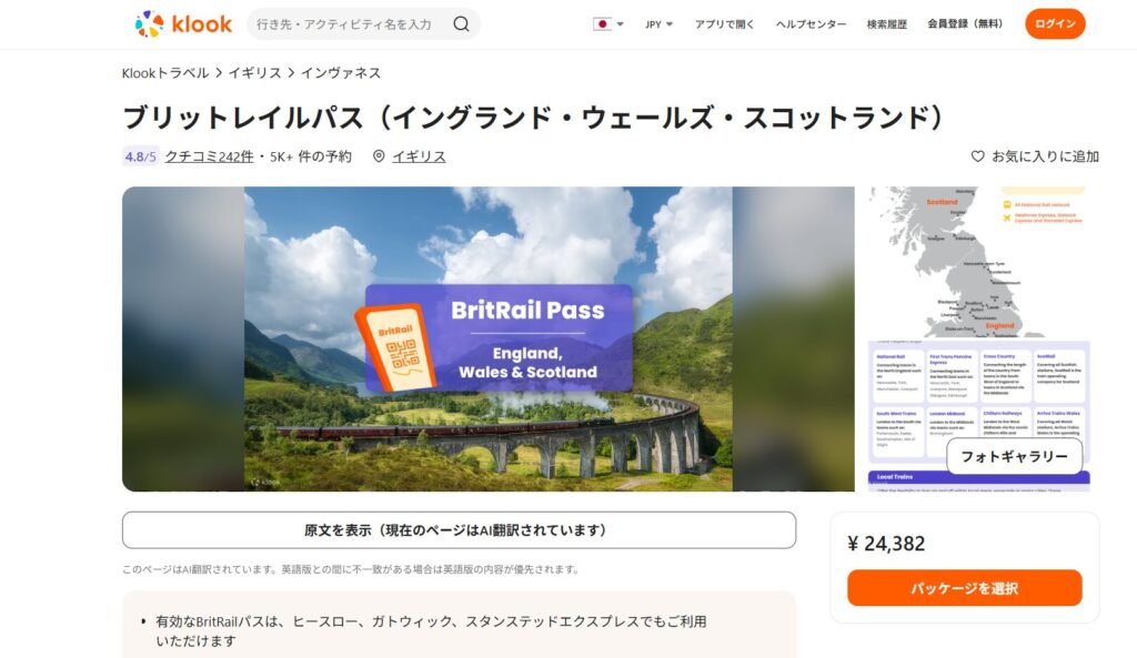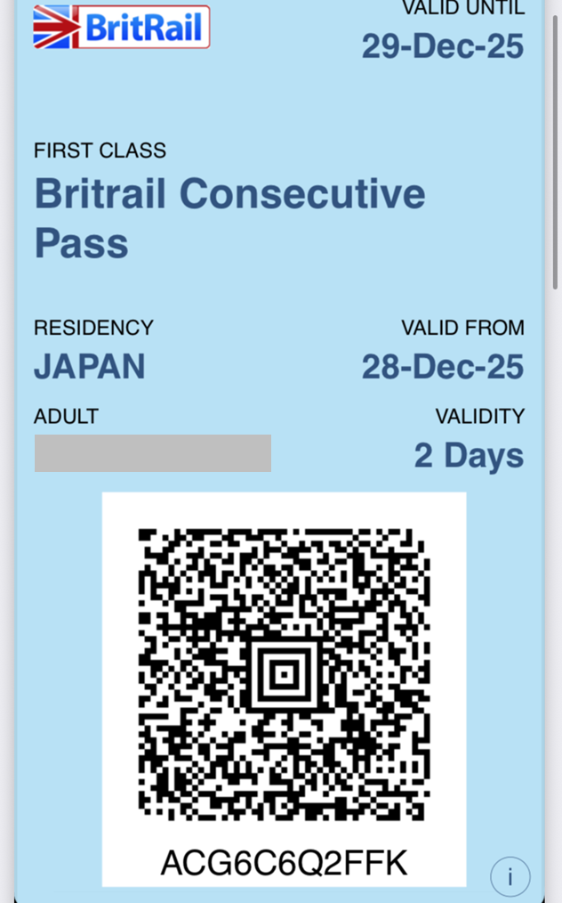 また、ブリットレイルパスという海外旅行客限定で利用できる鉄道乗り放題パスがあり、1等車と2等車を選択することができ、そこまで価格差がなかったため、1等車(ファーストクラス)に乗ることができるパスをKlookで購入してみました。