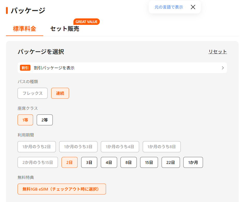 私は連続2日間の1等車のオプションで34,869円で購入しました。